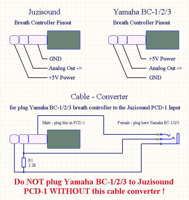 В старата версия на устройството нативно се поддържаше само дъховия контролер на Juzisound. За да се ползва някои от моделите на Yamaha BC-1/BC-2 или BC-3, те трябваше да се включват в специален допълнителен кабел - преходник, който компенсираше несъответствието в пиновете на буксите на двата контролера. В новата версия 2 на PCD-1 може ДИРЕКТНО да се включват и двата вида контролери, като нагласяването на пиновете става вече хардуерно - вътре от самото устройство, а избора на съответния контролер става софтуерно - от менюто на устройството. С една дума, кабел - преходник - вече не е необходим за да се работи с контролерите на Yamaha.