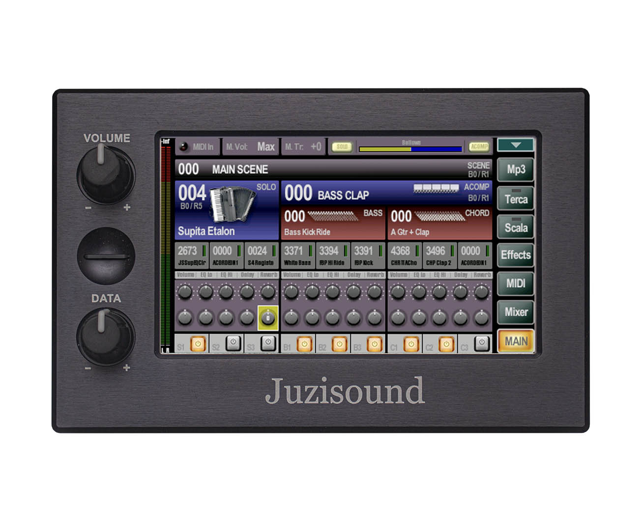 SCENE este o organizare de nivel superior, iar schimbarea scenei face schimbarea simultană a SOLO, F.BASS și CHORD, plus toate efectele și toți ceilalți parametri. Versiunea Sampler 3 pentru acordeon are 1000 de poziții pentru SCENE, iar sistemul MIDI Juzisound are control asupra schimbării SCENE.