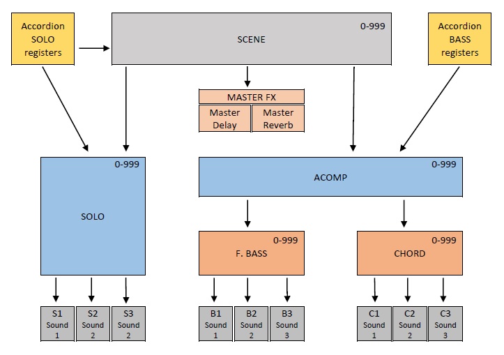 Un acordeon MIDI complet trebuie să aibă 3 părți principale: SOLO, BASUL Fundamental și Chord-ul. Fiecare dintre aceste părți trebuie să aibă o organizare independentă și să poată fi schimbate separat, ca în cazul acordeonelor acustice.