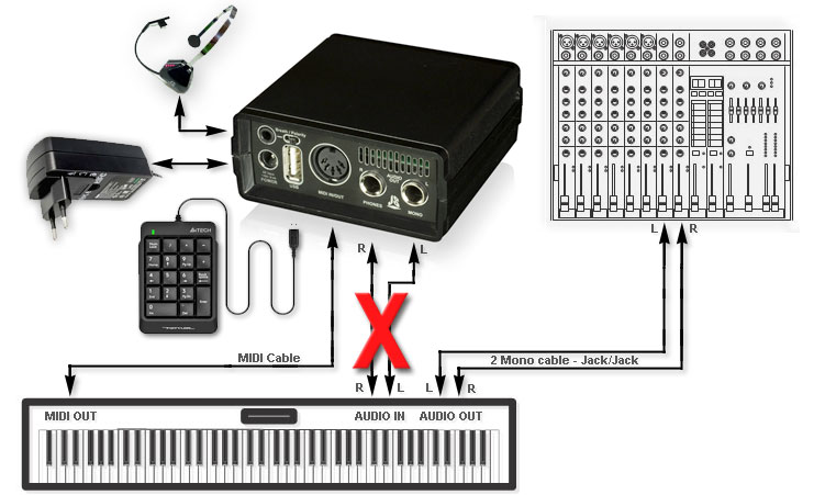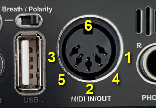 - Conectorul MIDI este unul singur, dar acest conector oferă 3 funcții combinate, disponibile simultan: intrare MIDI, ieșire MIDI și ieșire de alimentare pentru alimentarea sistemului MIDI la acordeon. Pentru funcția de ieșire MIDI și alimentare a acordeonului, sunt necesare cabluri speciale opționale.